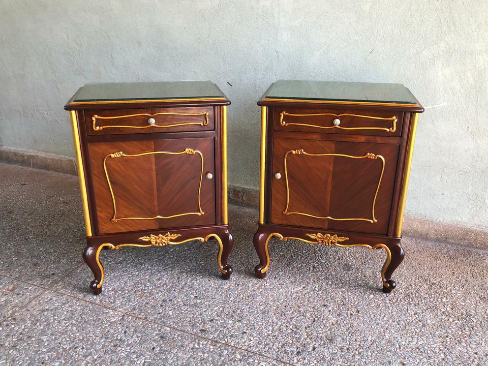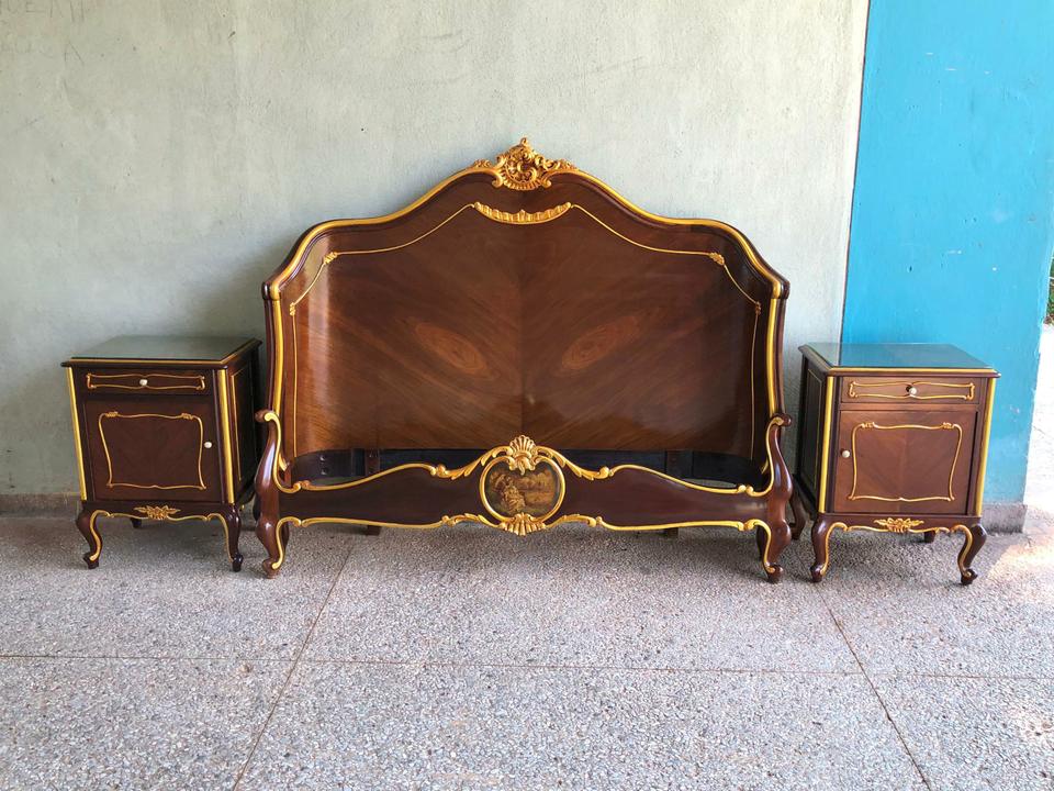 Cama imperial con sus dos mesitas de noche estilo Luis XV, acabada de restaurar. Cuenta con su bastidor y las mesitas tienen su cristal arriba.